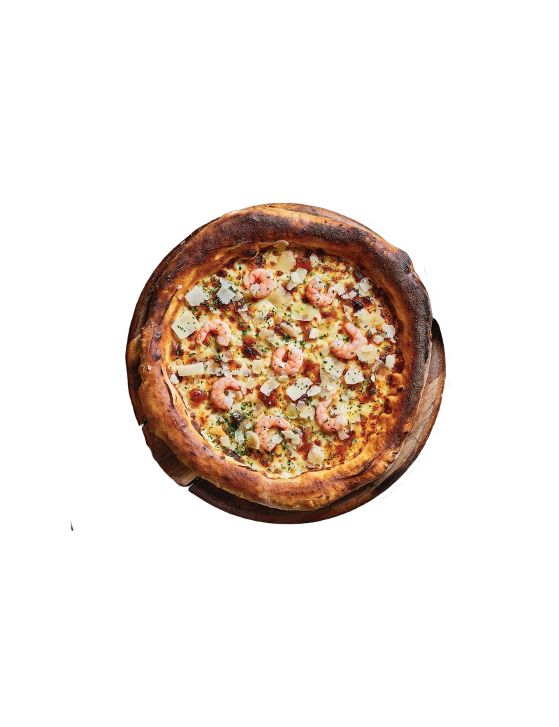 Crème fraiche, mozza, crevettes, oignons caramélisés, parmesan, huile extra vierge et persillade